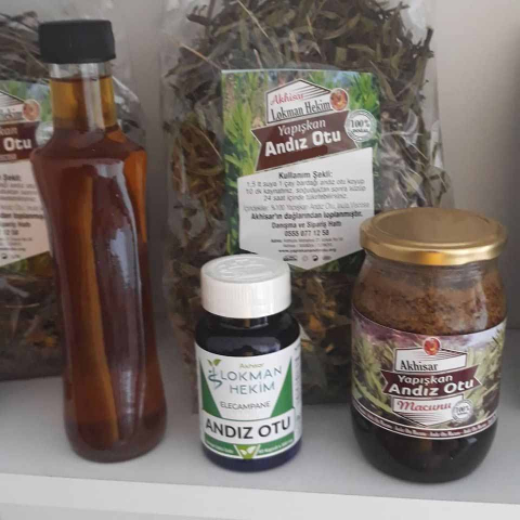 Bilimsel adı Inula helenium olup çok yıllık tıbbi bir bitkidir, Türkiyede 27 türü bulunmaktadır. Ülkemizde daha çok Manisa ve Akhisar yöresinde bulunmakla beraber Ege, Akdeniz havzasında yol kenarlarında ve su kenarlarında bulunmaktadır. İçerdiği kamfor nedeni ile güçlü aromatik kokusu vardır. Bitkinin gövde ve yaprakları sıcak havalarla artış gösteren yapışkan bir reçine ile kaplıdır. Yaz aylarının daha uzun sürdüğü Ege ve Akdeniz ikliminde bulunan yapışkan andız otunun reçinesi iklimin de etkisiyle Avrupa’ da bulunan hemcinslerine göre daha fazla güçlüdür.